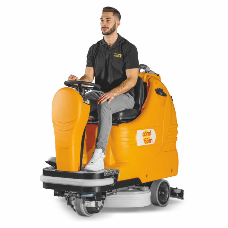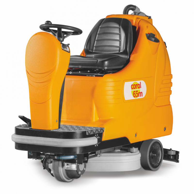 CORAL 65 M è una lavasciuga industriale operatore a bordo alimentata a batteria (24V / 240Ah). La macchina è dotata di due spazzole controrotanti disco del diametro di 345 mm che garantiscono una pista di pulizia di 66 cm.