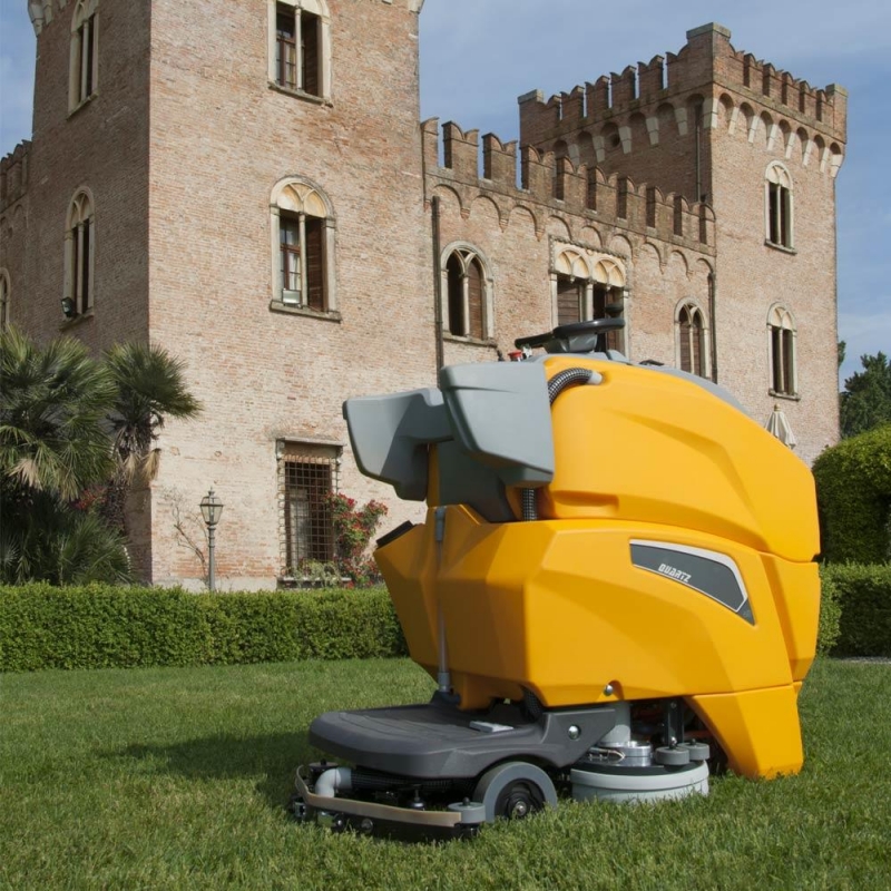 La macchina è alimentata a batterie ed unisce il comfort di una lavasciuga uomo a bordo e la agilità di una lavasciuga uomo a terra. I serbatoi, con capienza di 100 lt cadauno, garantiscono all'operatore di effettuare le operazioni di pulizia con un solo pieno di acqua e di non doversi fermare a ricaricare e/o scaricare l'acqua sporca.